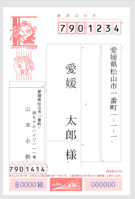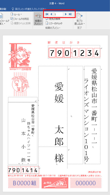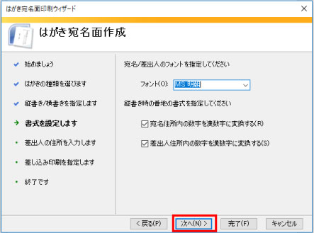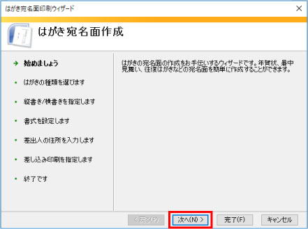 差し込み文章を選択し、はがき印刷をクリック、宛名面の作成選択