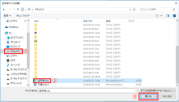 住所録ファイルが保存されているフォルダー表示し目的の住所録ファイルをクリックして開くをクリック